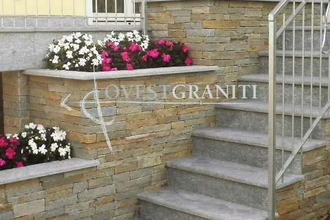 Rivestimento muro in liste di pietra di luserna colore misto, posa a "finto secco".